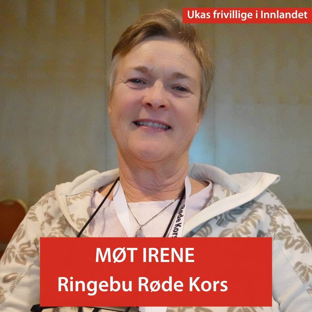 Irene har vært aktiv i Røde Kors hjelpekorps siden hun var 16 år. Da startet hun med opplæring, og deltok på de aktivitetene hun kunne. Irene er tildelt utmerkelsen æresmedlem i Røde Kors for sin lange og solide innsats. Nå bruker Irene mye av sin frivillighet på å holde kurs for bedrifter og foreninger i nærområdet. Å bidra til at mange kan førstehjelp er noe hun virkelig brenner for.