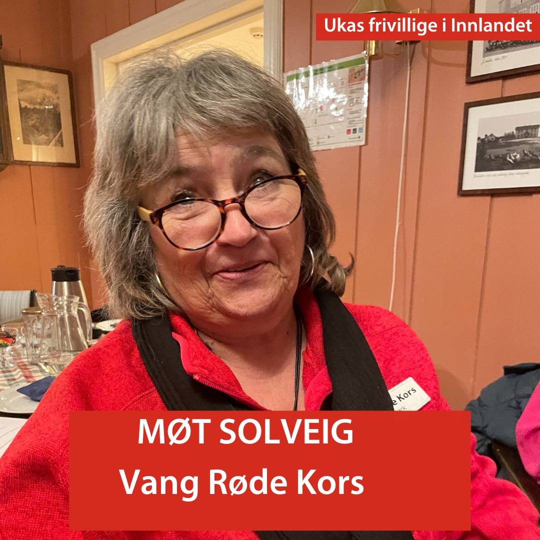 Solveig har vært frivillig i Røde Kors i over 15 år. Hun meldte seg som frivillig for å bidra i migrasjonsarbeid. Solveig er opptatt av at mennesker over 55 år, som er nye i landet vårt, også skal få mulighet til å lære norsk og er aktivitetsleder på norsktrening. Hun er også aktiv i styret i lokalforeningen, engasjert i internasjonal kvinnegruppe, vitnestøtte i retten, og med på å arrangere ønsketreet.